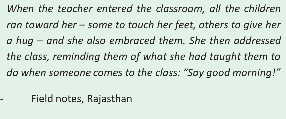 Our conversations with teachers made it clear that one key message that has been understood and accepted is that the early years of school require a different approach to teaching- learning. Without explicit prompting, many teachers spoke about what makes the ‘foundational’ age group special and why young children need to be treated differently. They articulated the importance of the transition from home to school and described how young children needed to enjoy coming to school and not feel afraid, before focusing on their studies. It was interesting to note that this conception of teaching-learning extended beyond the initial few months after children join school, to the entire foundational stage of schooling.