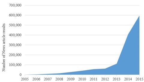 Figure 1. Analysis of Google News trends to show the number of mentions of the word ‘rape’ in news stories over 2005-2015