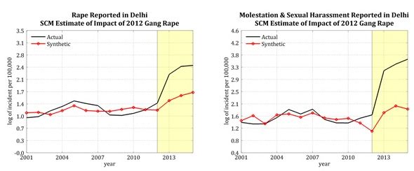 Based on the National Crime Records Bureau (NCRB) data, our SCM estimates show that, in Delhi, the 2012 Nirbhaya case had a positive and significant impact on the reporting of crimes against women. From 2013 to 2015, the annual average reporting of rape cases in Delhi was 23% higher compared with that in the pre-intervention period (2001-2011) (where the ‘intervention’ refers to the occurrence of the Nirbhaya rape case); average annual reporting of molestation and sexual harassment over the period 2013-2015 was 40% higher compared with its pre-intervention annual average.