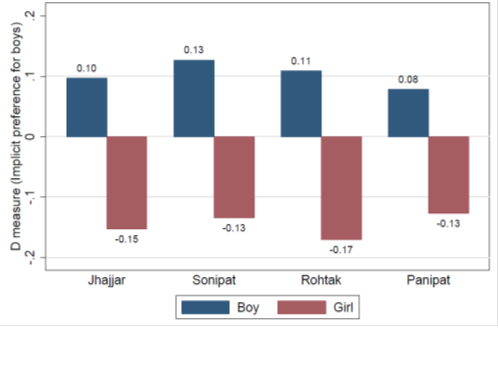 The test revealed that boys disproportionately associate males with good attributes and females with bad attributes. Interestingly, the smallest bias against girls is in Panipat, the study district with the most balanced sex ratio. Girls are not gender neutral, but rather disproportionately associate female with good attributes and male with bad attributes. This finding is quite striking considering that for self-reported attitudes on the survey, many girls display pro-boy bias, for example saying that it is more important for parents to send sons than daughters to school (though the extent of girls’ self-reported pro-boy bias is lower than that of their male classmates’ pro-boy bias).