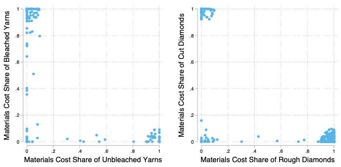 We use production data from the 2000-01 to 2012-13 rounds of the Annual Survey of Industries (ASI), which is India’s main source of official statistics on the formal manufacturing sector. The ASI covers all plants that have more than 20 employees (or 10 employees if the plant uses power). An interesting feature of the dataset is that it contains detailed product-level information on each plant's intermediate inputs and outputs. These data on inputs allow us to better differentiate between different organisational modes of production. As an example, Figure 1 shows different input mixes among plants that produce bleached cotton cloth and those that produce polished diamonds. These different input mixes correspond to different degrees of vertical integration of the plants: plants that produce polished diamonds from raw diamonds do both cutting and polishing, whereas plants that produce polished diamonds from cut diamonds do just the polishing. Presumably, much of this variation in organisation or technology will arise naturally and is not associated with inefficiencies. Nevertheless, we will show that some of it is driven by weak contract enforcement.