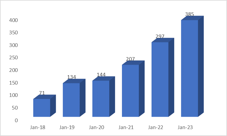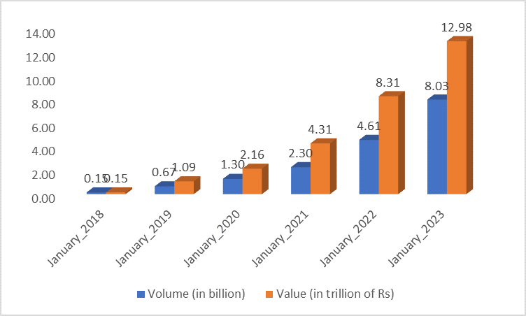As per the NPCI database, the total number of banks that became part of UPI systems increased by almost 11 times, from 35 in January 2017 to 385 in January 2023 (Figure 1). During the same period, transaction volumes on UPI grew 1802 times, from 4.46 million in January 2017 to 8.03 billion in January 2023, while total transaction value rose 766 times, from Rs. 16.90 billion to 12.98 trillion (Figure 2).