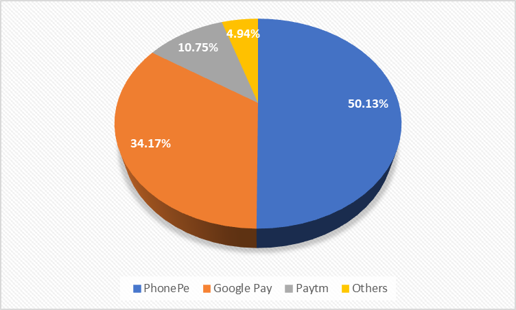 The volume of transaction through UPI was highest in January 2023, at around 20% of the Indian GDP. As per the Economic Survey of Government of India, 2022-23, UPI accounted for 52% of the total 88.4 billion financial digital transactions in FY2022-23. Interestingly, around 77% of such digital transaction (in terms of value) in January 2023 were Peer-to-Peer (P2P) payments, and more than 95% of such transaction were done through just three digital payment platforms – PhonePe (50.13%), Google Pay (34.17%) and Paytm (10.8%) (see Figure 3).