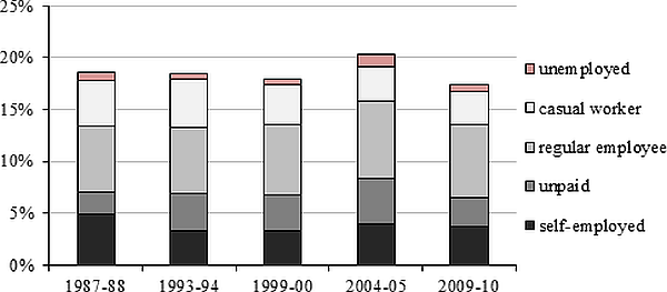 Note: Sample comprises married women aged 25-54. Self-employment includes employers and own account workers. Unpaid refers to unpaid family workers. Source: National Sample Survey Employment and Unemployment Survey. Analysing the stagnation of female labour force participation rates