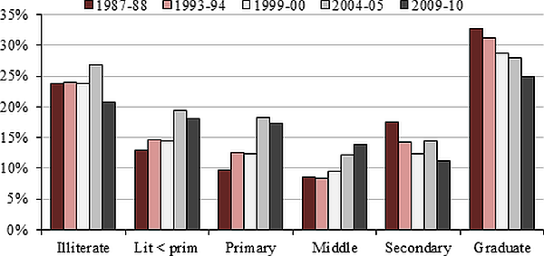 Using data from five National Sample Survey (NSS) Employment and Unemployment Surveys spanning 1987-1988 to 20092010, we investigate the proximate causes of this surprising stagnation of female labour force participation over the past 20 years (Klasen and Pieters 2013). After carefully checking whether this low level might be related to undercounting of female activity (for which we find little evidence), we first note that there is a U-shaped pattern of the association of female education with female labour force participation. As shown in Figure 2, this means that at very low levels of female education, activity rates are high. They are much lower at medium education levels, and rise again at higher levels. Over time, this U has gotten more muted and shifted to the right: the low point has shifted from middle school education to secondary education, while the increase at graduate level is now much smaller than it was in 19871988. In contrast, male participation rates areclose to 100% and do not differ by education level.