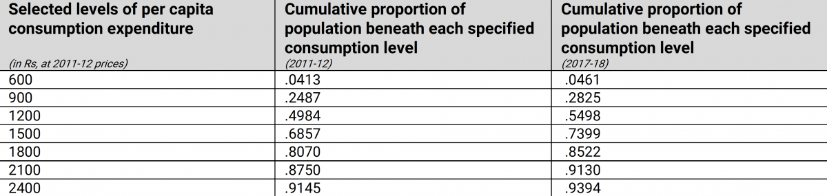 Table 1. Cumulative density functions of consumer expenditure for 2011-12 and 2017-18