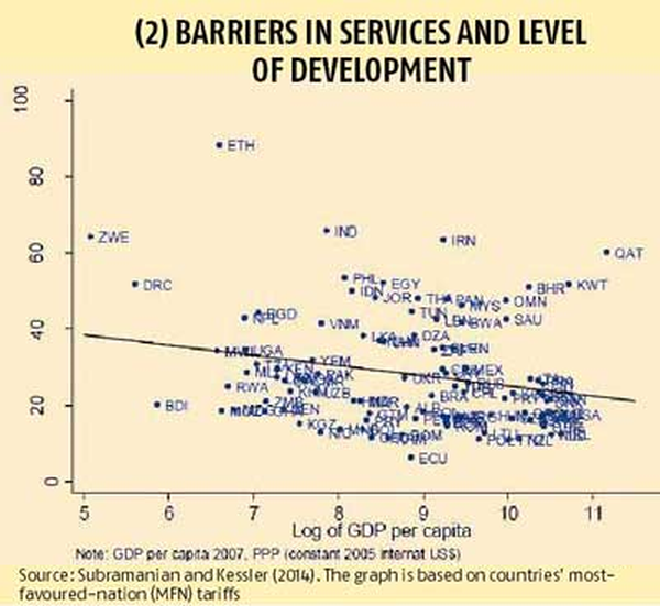 The key points are that: first, India´s overall barriers in services (denoted by the "IND" symbol) are among the highest in the world (surpassed only by Zimbabwe) and nearly 4-5 times greater than those in Organisation for Economic Co-operation and Development (OECD) countries; and, second, they are also very high for India´s level of development because India is well above the line.