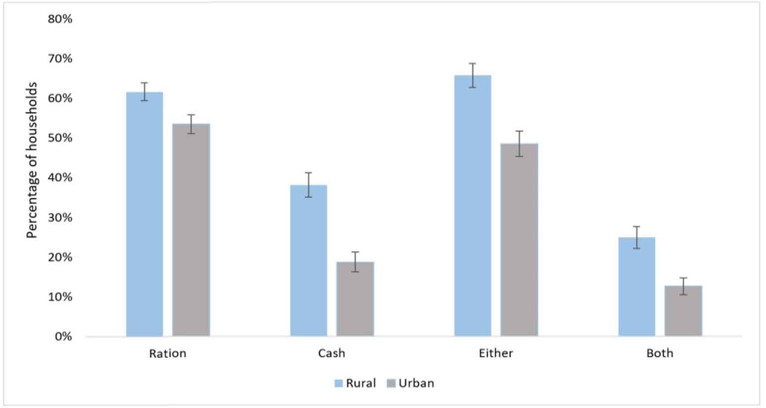 हमने पाया कि चूंकि सुरक्षा जाल तक पहुंच पहले से मौजूद रजिस्ट्रियों पर निर्भर थी, इसलिए लॉकडाउन से सबसे अधिक प्रभावित कुछ परिवार इस लाभ से बाहर हो गए। इसके अलावा, आर्थिक संकट के अनुभव में ग्रामीण-शहरी भिन्नता सामाजिक सुरक्षा जाल तक पहुंच में परिलक्षित नहीं होती है। कुछ परिवारों को खाद्यान्न प्राप्त हुआ, अन्य को नकद अंतरण प्राप्त हुआ, लेकिन विशेष रूप से शहरी क्षेत्रों में,बहुत कम लोगों को दोनों लाभ प्राप्त हुए(चित्र 1 देखें)। हम यह भी पाते हैं कि शहरी निवासियों की नकद अंतरण प्राप्त करने की अनुमानित संभावना उनके ग्रामीण समकक्षों की तुलना में आठ प्रतिशत कम थी।
