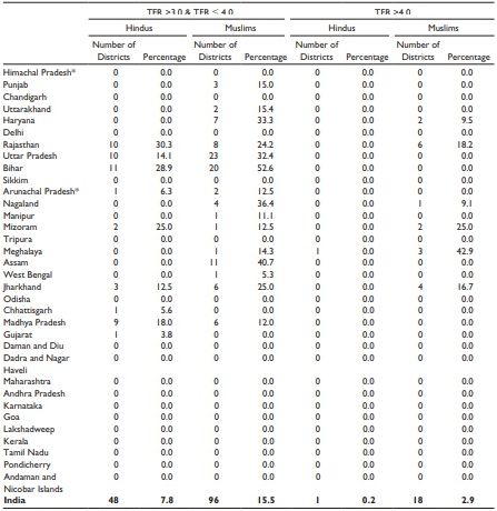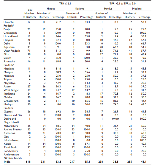 Table 2. Percentages of districts falling under different levels of fertility for Hindus and Muslims for all states in India (excluding Jammu & Kashmir)