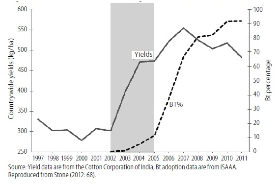 Stone’s rebuttal of the Bt “triumph narrative” has two legs. First, he argues that Bt could not have been a major driver of dramatically higher yields because Bt adoption was low in the period of increasing yields. Second, an unexamined Figure 1 shows yields falling in recent years despite virtually universal adoption of Bt technology by farmers (Stone 2012: 68). Let us examine these two claims, beginning with Stone’s adoption data. The data are systematically inaccurate in purporting to give us the national area under Bt cotton yearly, and thus the extent of diffusion of the technology. Measuring diffusion of cultivars5 is easy if there is a single source or effective control. Bt cotton violated these conditions egregiously. It was in fields illicitly for three years before the Government of India discovered it in 2001, even though none could be grown legally without government approval (Scoones 2006, Jayaraman 2001). Once the ‘desi Bt’ of Navbharat Seeds was banned in 2001 by the Genetic Engineering Approval Committee in Delhi, ‘Bt variants’ diffused underground from growers engaged by Navbharat to produce hybrids containing the Bt transgene (in this case, the cry1Ac, the same gene used in Bt brinjal). As farmers found the Bt seeds successful, underground diffusion accelerated – best documented in Gujarat (Roy 2006). How do we then know the area under Bt seeds? Stone confidently presents International Service for the Acquisition of Agri-biotech Applications (ISAAA) data to show area under Bt cotton nationally in his Figure 1. ISAAA quite explicitly recognises the ubiquitous illegal diffusion of biotech seeds in various countries, including India, but their figures exclude uncountable stealth seeds
