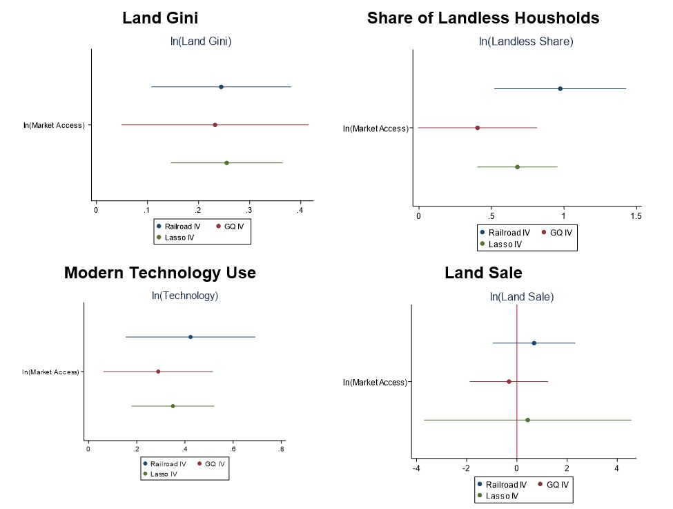 आकृति-2 में तीन वैकल्पिक अनुमान रणनीतियों के तहत अनुमानित परिणामों को दर्शाया गया है। पहले अनुमान में एक साधन के रूप में औपनिवेशिक रेलमार्ग की लम्बाई (रेलरोड IV) का उपयोग किया है और दूसरे में स्वर्णिम चतुर्भुज नेटवर्क (जीक्यू IV) की दूरी का उपयोग किया गया है। तीसरे अनुमान में इन दोनों (लासो IV)4 सहित संभावित साधन चरों के एक सेट में चयन के लिए एक सांख्यिकीय पद्धति का उपयोग किया गया है। यहाँ अनुमानों में कुछ भिन्नता है, फिर भी परिणाम काफी सुसंगत हैं।
