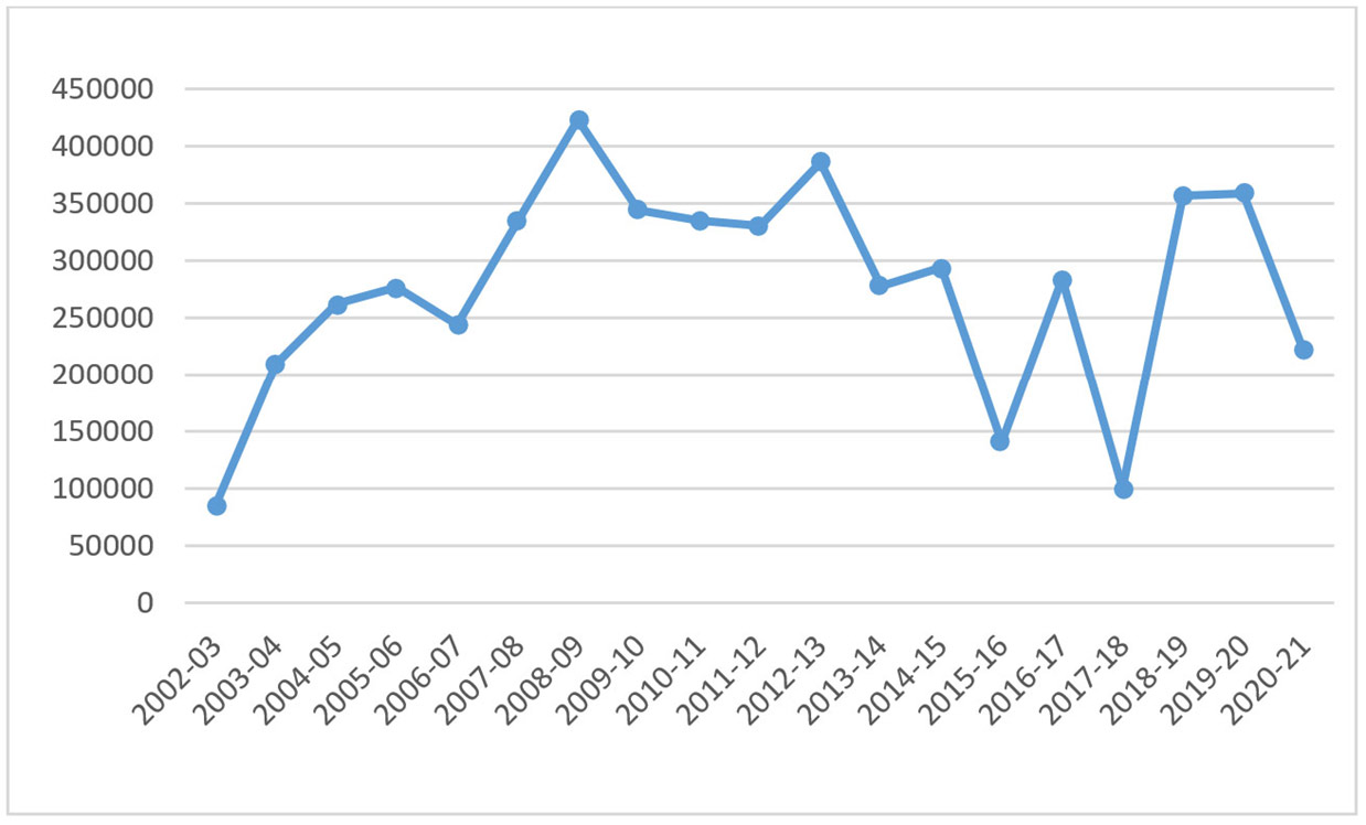 टिप्पणियाँ: (i) 2002-03 से 2020-21 तक की एक एकल समय-श्रृंखला के अभाव में, डेटा को तीन अलग-अलग सरकारी स्रोतों (खुला सरकारी डेटा पोर्टल, ग्रामीण विकास मंत्रालय का एनएसएपी डैशबोर्ड और ग्रामीण विकास मंत्रालय की वार्षिक रिपोर्ट) से संकलित किया जाना था। (ii) कुछ वर्षों से इन तीनों स्रोतों में विसंगतियां हैं। ऐसे वर्षों के लिए, ग्राफ़ में उन आंकड़ों का उपयोग किया गया है जो रुझान के करीब हों।