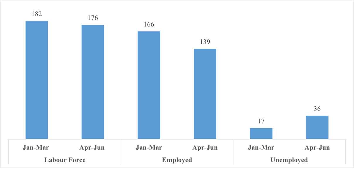 हमने जनवरी-मार्च 2020 और अप्रैल-जून 2020 की तिमाही के श्रम बल1, कार्य बल2 और बेरोजगारी के आंकड़ों को ‘15 वर्ष और उससे अधिक’ उम्र के लोगों के लिये आकृति-1 में वर्णित किया है। वर्णन के अनुसार, लगभग 18.2 करोड़ लोग या तो नौकरी की तलाश कर रहे थे या लॉकडाउन से ठीक पहले की तिमाही में कार्यरत थे। हालांकि, लॉकडाउन अवधि के दौरान लगभग 70 लाख लोग श्रम-बल से बाहर हो गये।