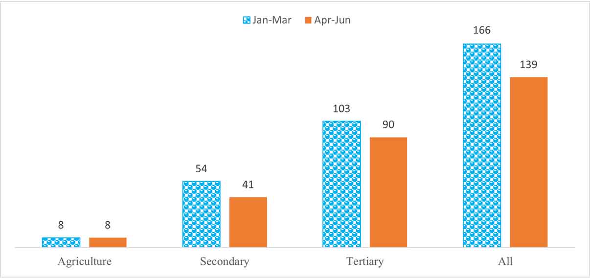 उद्योग तथा रोजगार की व्यापक स्थिति के अनुसार रोजगार अनुमान के आंकड़े आकृति-2 और 3 में प्रस्तुत किये गए हैं। अनुमान के अनुसार, जनवरी-मार्च 2020 तिमाही में लगभग 16.6 करोड़ लोगों को रोजगार मिला हुआ था। अप्रैल-जून 2020 में, पिछली तिमाही की तुलना में रोजगार में गिरावट लगभग 2.6 करोड़ रही, जिसमें 1.9 करोड़ पुरुष और 70 लाख महिलाएं थी (आकृति-1)। वहीं शहरी कृषि क्षेत्र में पिछली तिमाही की तुलना में अप्रैल-जून 2020 में नियोजित व्यक्तियों की संख्या में कोई बदलाव नहीं होने के कारण शहरी कृषि क्षेत्र स्थायी बना रहा। जबकि, द्वितीयक और तृतीयक क्षेत्रों में नौकरीयो का नुकसान हुआ (आकृति-2)। इससे सबसे ज्यादा प्रभावित सामान्य श्रमिक हुए। लॉकडाउन से पहले की तिमाही के दौरान नियोजित लगभग 1.9 करोड़ श्रमिकों में से लगभग 90 लाख ने अप्रैल-जून 2020 के दौरान अपनी नौकरी खो दी (आकृति- 3)। ‘आकृति-नियमित वेतन और वेतनभोगी’ श्रेणी में 1 करोड़ और ‘स्व-नियोजित' श्रेणी में लगभग 60 लाख लोगों की नौकरियाँ खत्म हो गयी। इनमें से कुछ को हो सकता है कि लॉकडाउन के कारण नौकरी छोड़ने को मजबूर किया गया हो और हो सकता है कि कुछ ने कोविड -19 के डर के कारण स्वेच्छा से ऐसा किया हो।