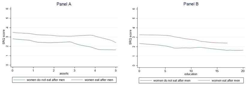 आकृति 2 से पता चलता है कि जो महिलाएं आखिर में भोजन करती हैं उनका मानसिक स्वास्थ्य ज्यादा खराब होता है, ऐसा शिक्षा और संपत्ति के अंतर को समायोजित करने बावजूद भी होता है। अनुभवजन्य विश्लेषण उत्तरदाता के उम्र, जाति, धर्म और राज्य से भी प्रभावित होता है, और यह भी पाता है कि अंत में खाना इस आबादी में मानसिक स्वास्थ्य को सही से पूर्वानुमान करता है।
