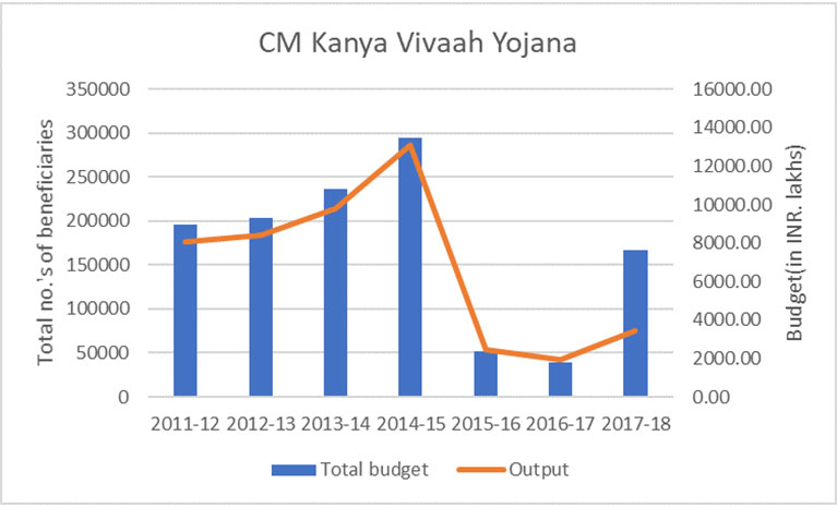 Figure 3. Gender budgets and gender outputs for Kanya Vivaah Yojana (2011-12 to 2017-18)