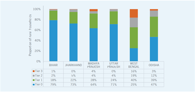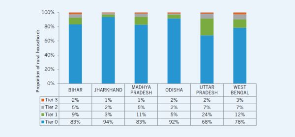 As Figure 1 shows, a clear majority of households across the six states have very limited electricity access. The only states in which the majority of households have Tier 1 or higher access are Odisha and West Bengal, and only West Bengal has a significant number (one in every three) of households in Tiers 2 or 3. Although rural electrification rates are relatively high across the states, especially when off-grid technologies are also considered, the overall quality of electricity supply remains very poor.