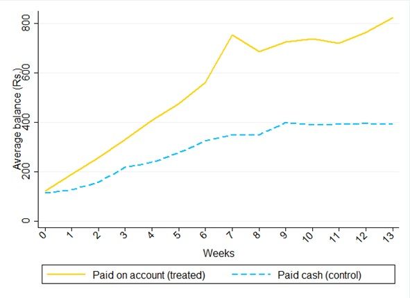 First, we find that being paid through a bank account instead of in cash increased the account balance by around 110% (or almost Rs. 420) after three months of weekly payments. This can be seen in Figure 1 below. The interviews started in week 1 and ended in week 13. On average, the account balance of the people who were paid through their account increased much quicker than that of the respondents who were paid in cash.