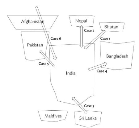 Notes: (i) The arrows indicate the potential flow and direction of power between countries once the interconnection is in operation; (ii) Interconnections between India and Bhutan, Nepal and Bangladesh (Cases 1, 2 and 4) are anticipated to be operational in the next five years, while interconnections between India and Sri Lanka, Pakistan, and Central Asia (Cases 3, 5 and 6) are expected to be longer-term (5-10 years).