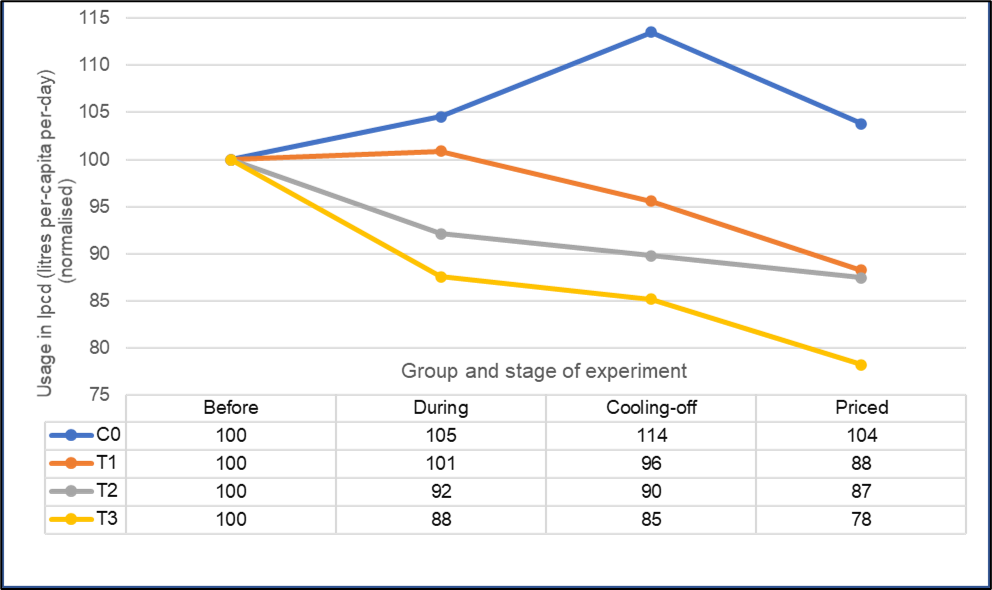 Our study shows the potential of behavioural interventions as a relatively inexpensive tool that can free up a large part of water supply from such high-consuming households, without the social and political hurdles associated with other policy alternatives – such as billing for water at a high-enough price-point, or the practical hurdles in enforcing restrictions towards a reasonable level of water usage. Our results support the effectiveness of behavioural interventions – both with and without the presence of price as an incentive to conserve.