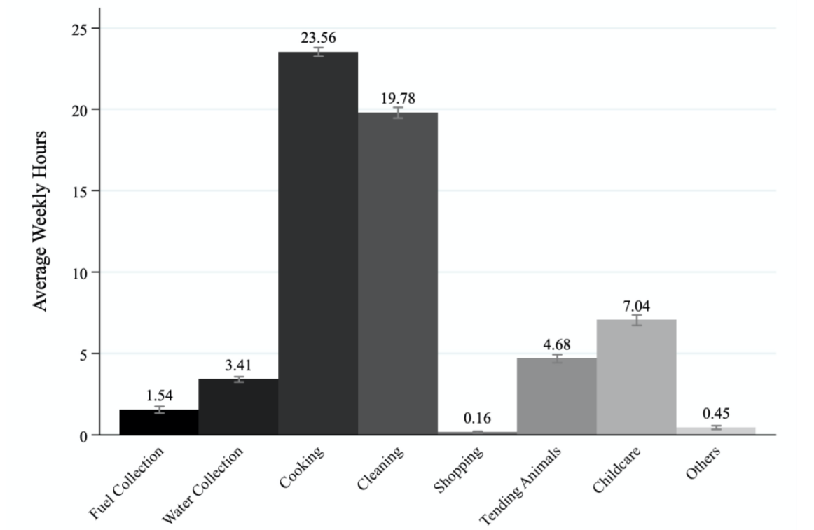 It is a well-known fact that women bear a large burden of not just using, but also collecting, polluting biomass and solid fuels such as wood and cow dung for cooking in rural contexts. For example, in India, Bangladesh, and Nepal, women often spend up to 20 or more hours per week collecting biomass fuels. Women also spend a large amount of time cooking, as shown by data from the 2019 Time Use Survey (TUS) of India. A granular 24-hour time use survey of almost 3,000 primary cooks in households in rural Indore in Madhya Pradesh in 2018 (Afridi, Debnath, Dinkelman and Sareen 2023) similarly shows that of the 60 hours spent on domestic work by rural women per week, the majority (more than 40 hours) is spent on cooking and cleaning – almost four hours per day, on average (Figure 1), which is equivalent to a part-time job. Almost 75% of these women use firewood and cow dung for cooking, which not only makes cooking and cleaning more time-consuming but also exposes these women to cardiovascular and lung disease due to indoor smoke inhalation.