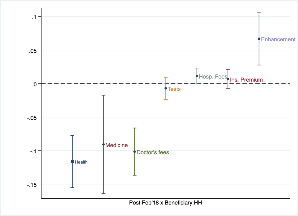 Our findings reveal a 11.6% decline in total health expenditure of beneficiary households as compared to the non-beneficiaries upon the infliction of EPF cuts. In other words, we find a reduction in monthly expenditure on healthcare by households that receive an additional income, as compared to households that do not receive the income benefit. The coefficient estimates for both healthcare as a whole and various categories of health expenditure have been highlighted graphically in Figure 1.