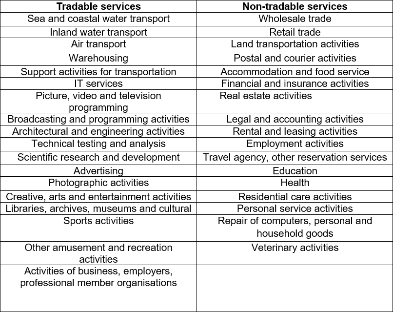 Following these definitions, implied bilateral trade costs can be expressed as a ratio of intra-national to international trade flows. All else being equal, the more two countries trade with each other, the lower is the measure of relative trade costs. Conversely, if domestic consumption becomes relatively more important in either country, this indicates larger international trade frictions or lower tradability. We set the threshold for trade costs equal to the highest level for manufacturing, such that all manufacturing is just tradable. Our sample then contains 35 broad service sectors, of which 17 are classified as non-tradable (Table 1).