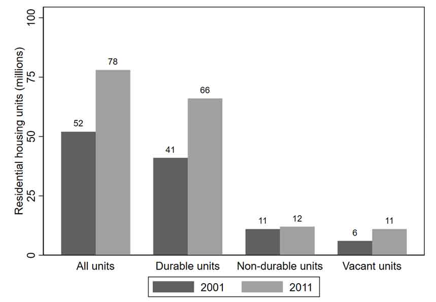 With about 377 million people, India has the second-largest urban population in the world, and its urban population is growing at a decadal rate of 32% (Census 2011). Has urban India's housing supply kept pace with this rising demand? In Figure 1, we use Census data to show the growth in the housing stock in Indian cities between 2001 and 2011. While the formal (durable) housing stock grew by 61%, the informal (non-durable) housing stock grew at a modest pace of 9%. At the same time, the stock of urban India's vacant houses also increased by about 80%. Do these figures mean that India's housing shortage problem was resolved, and the urban markets started oversupplying during the 2000s?
