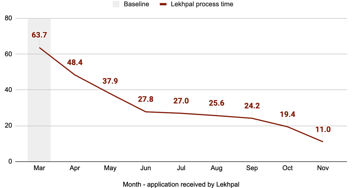i) Improvement in turnaround times: Between March and November 2024, the data showed notable improvements in the timeliness of Lekhpals in handling citizen applications under the Integrated Grievance Redressal System (IGRS) and selected sections under the Sub-Divisional Magistrate (SDM) Court. In particular, within eight months of the implementation of LAKSHYAM, the processing times for SDM court applications reduced by 93% (from 113 days to 19 days) in total, and by 83% (from 64 days to 11 days) when we look at the part of the process led by Lekhpals.