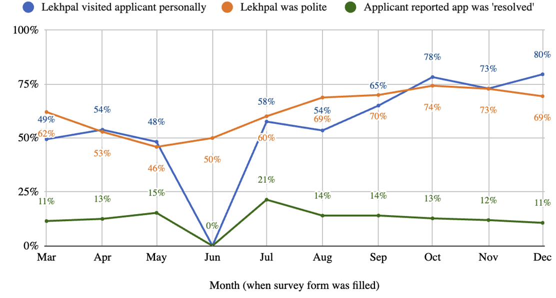 ii) Improvements in desired behaviours in citizen interactions: Many Lekhpals spoke about field-level improvements in desired behaviours in citizen interactions. They credit the citizen surveys introduced by LAKSHYAM for instilling greater awareness and sensitivity in their engagement with citizens. Analysis of the citizen feedback survey showed that the share of applications for which Lekhpals conducted field visits rose from 49% to 80%, and perceived politeness ratings rose from 62% to 69%, peaking at 75% in October.
