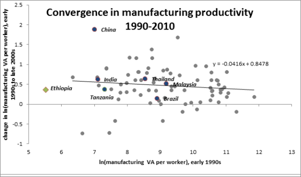 Unfortunately, Figure 2 also shows that unlike the East Asian Tigers like China, Malaysia and Thailand which are above the trend line, the Lions of Africa like Ethiopia and Tanzania are well below the trend line, implying a much slower progress in their manufacturing sector compared to the East Asian Tigers.