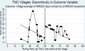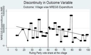 To address the first challenge, we looked at the constituencies where politicians of the ruling party marginally won elections at the village level versus the constituencies where they marginally lost. Since constituencies where the ruling party marginally won elections should be no different than the constituencies where they marginally lost, comparing the constituencies in this way allowed us to see whether MNREGA allocation of funds or its implementation in constituencies where the ruling party marginally won differed significantly from the cases where the ruling party marginally lost constituencies. If we did find that there was a significant difference, we could attribute this to the targeting of the winning constituency by the ruling party. To address the second challenge, we looked at the effect of increased MNREGA funds and implementation that could be reliably attributed to targeting of marginal constituencies by the ruling party on electoral returns of the incumbent party.