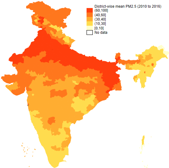 Figure 1. Mean pollution (PM2.5) in India across districts of India: 2010-2016