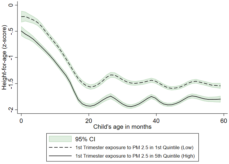 Note: Polynomial fit plot between height-for-age and child's age in months for children who had low level of exposure to pollution (1st Quintile) versus those who had high level of exposure (5th Quintile) to pollution during their first trimester. Shaded area is 95% confidence interval2.