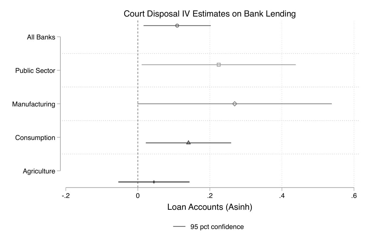 बैंक के प्रकार के अनुसार एक परीक्षण से पता चलता है कि यह वृद्धि सार्वजनिक क्षेत्र के बैंकों के लिए और भी बड़ी है, जो देश के सभी बैंकों के लगभग 80% का प्रतिनिधित्व करते हैं। इसके अलावा, मुझे लगता है कि विनिर्माण और उपभोग की ओर ऋण में महत्वपूर्ण वृद्धि देखी जाती है, जो यह दर्शाती है कि न्यायालयों की भूमिका ऋण बाजारों के कामकाज में महत्वपूर्ण हैं, जो अर्थव्यवस्था में उत्पादन और उपभोग को प्रभावित करता है।