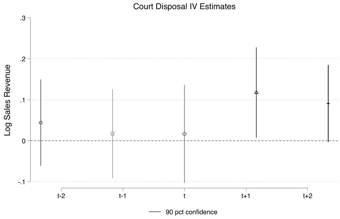 नोट: ऊर्ध्वाधर-अक्ष समय तत्व को दर्शाता है। इससे पता चलता है कि किसी वर्ष (टी) में अदालत की निपटान दर में सुधार एक-दो साल बाद परिणामों को प्रभावित करता है। सभी परिणाम उपायों को इस प्रकार परिवर्तित किया गया है ताकि अनुमानों की व्याख्या प्रतिशत परिवर्तनों के संदर्भ में की जा सके। अनुमानों के आसपास की त्रुटि पट्टियाँ 95% विश्वास अंतराल का प्रतिनिधित्व करती हैं, अर्थात्, इस बात की 95% संभावना है कि यह अनुमान इस सीमा के भीतर है।