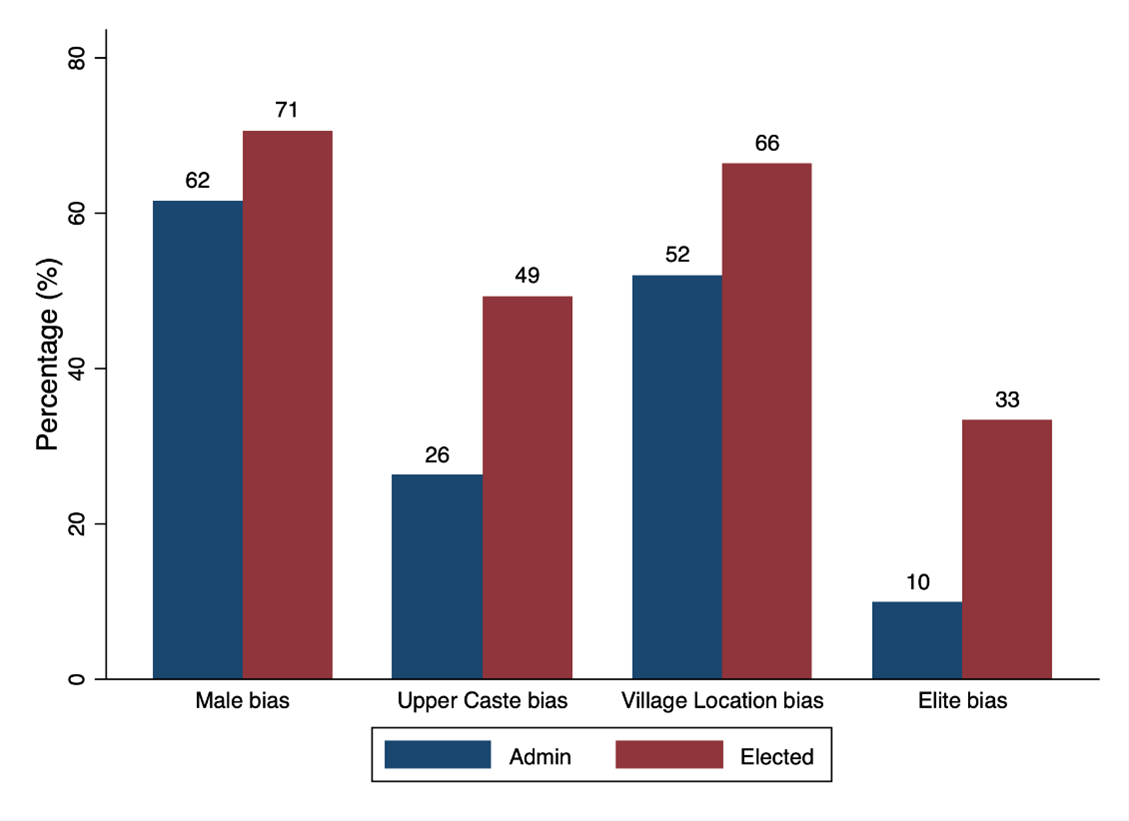 उदाहरण के लिए, नौकरशाहों द्वारा संचालित ग्राम पंचायतों में, खर्च महिलाओं की प्राथमिकताओं की तुलना में पुरुषों की प्राथमिकताओं के साथ 62% अधिक मज़बूती से सहसंबद्ध है। हालांकि, जब राजनेता व्यय आवंटित करते हैं तो ये प्रतिनिधित्व अंतर और बढ़ जाता है।3  यह व्यय अभिजात वर्ग के समूहों की प्राथमिकताओं के साथ और भी अधिक मज़बूती से सहसंबद्ध हो जाता है, जबकि वंचित समूहों को सीमित लाभ प्राप्त होता है। नौकरशाहों द्वारा संचालित ग्राम पंचायतों में लैंगिक प्रतिनिधित्व (पुरुष-महिलाएं) अंतर 62% से बढ़कर राजनेताओं द्वारा संचालित ग्राम पंचायतों में 71% हो जाता है, और हमें जाति के सन्दर्भ में भी इसी तरह के पैटर्न नजर आते हैं (जैसा कि आकृति-1 में दर्शाया गया है)। यहाँ तक कि शक्तिशाली समूहों के बीच भी, राजनीतिज्ञों द्वारा संचालित ग्राम पंचायतों में किया जाने वाला व्यय केवल ग्राम पंचायत के मुख्य गाँव में रहने वाले नागरिकों की प्राथमिकताओं के साथ अधिक सहसंबद्ध हो जाता है। इस प्रकार, निर्वाचित नेता औसतन नागरिकों की प्राथमिकताओं का बेहतर प्रतिनिधित्व करते हैं (और राजनेताओं द्वारा किसी भी समूह का खराब प्रतिनिधित्व नहीं किया जाता है), जबकि प्रतिनिधित्व लाभ मुख्य रूप से ग्राम पंचायत के मुख्य गाँव में सामाजिक रूप से लाभान्वित नागरिकों को प्राप्त होता है।