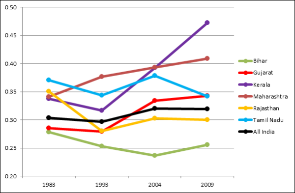 In terms of improving their relative ranking over the span of three decades, the top performers are Maharashtra, Gujarat, Kerala and Tamil Nadu. Interestingly, the rise in the ranks of these four states has been accompanied by the relative decline of one state, namely Punjab, which went from being the very top state in the 1980s and 1990s, to number 7 in 2010. This suggests that, as in athletic races, the relative rank of a state may go up or down due either to a change in its own performance or to a change in the performance of a rival.