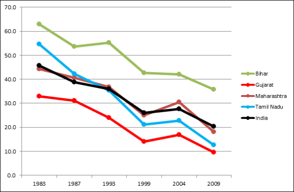 Lastly, we consider the percentage of population below the poverty line (Table 5). We find that Himachal Pradesh, Punjab, Kerala, Gujarat, Haryana, AP and Karnataka have consistently had lower levels of poverty than the all India average. Gujarat’s performance in poverty reduction over the years has been similar to that of AP and Kerala. However, if we look at improvements in performance over the last decade, then Tamil Nadu is one of the top performers. Starting from a level of poverty that was higher than the national average in 1983, it ended up at a much lower level, similar to that of Gujarat, AP and Kerala, in 2009 (Figure 5). Bihar, although well above the national average in terms of poverty levels all through the three decades, has shown a sharp improvement over the last decade.