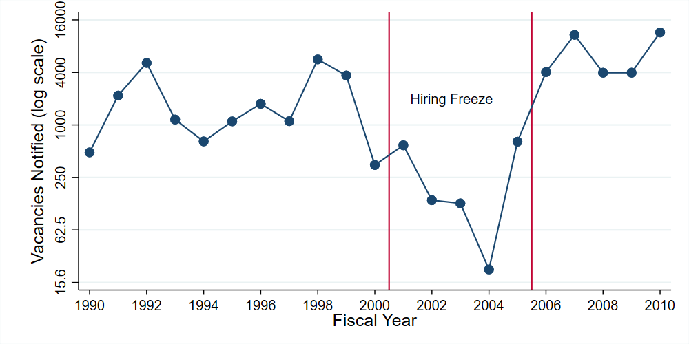 मैंने इस प्रश्न का समाधान पाने के लिए, हाल के शोध (मंगल 2022) में एक नीति के सामाजिक-आर्थिक प्रभावों का अध्ययन किया है जिसके कारण सार्वजनिक क्षेत्र की भर्ती परीक्षाओं की प्रतिस्पर्धात्मकता बढ़ी है। वर्ष 2001 और 2006 के बीच, तमिलनाडु सरकार ने भर्ती पर आंशिक रोक लागू की, जिससे रिक्तियों की उपलब्धता 86% कम हो गई (आकृति 1 देखें), लेकिन अन्यथा कुल मांग बरकरार रही।