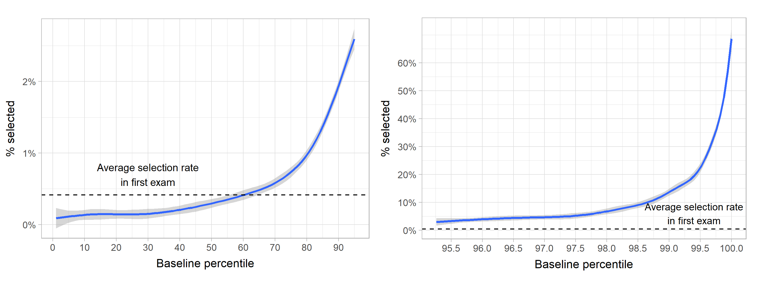 आकृति 2. उम्मीदवारों का प्रारंभिक स्कोर और नीचे के 95% (बाएं) और शीर्ष 5% (दाएं) के लिए चयन की संभावना