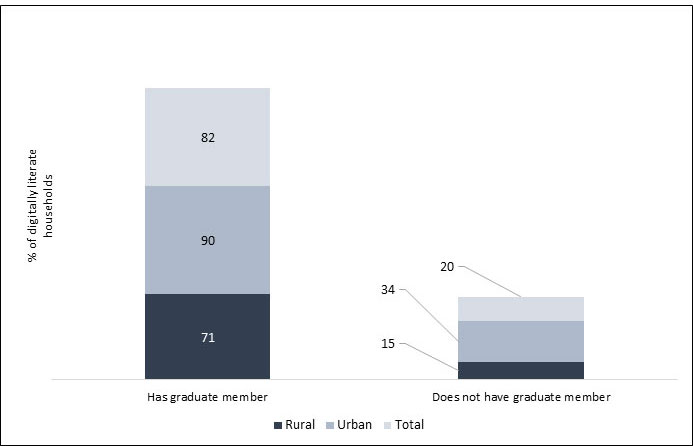 In terms of education, if a member of the household is a graduate there is a 71% chance that the household is digitally literate in rural areas, and 90% in urban areas.