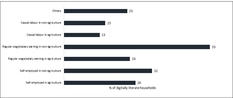 By occupation profile in rural India, households that reported to have received regular wages/salaries from non-agricultural occupations have the highest percentage of digitally literate households at around 53%. In contrast, casual workers in the agriculture sector have the lowest level of digital literacy at 13%. In urban India, digital literacy is highest among regular wage/salaried workers at 73% and lowest among casual workers at 30%.