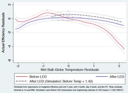 We find that LED installation has a large impact on hot days, when heat stress reduces worker productivity most – there is almost no impact of LEDs on cooler days.