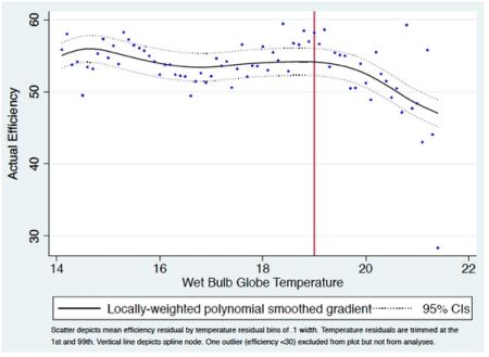 The reason that LEDs augment only the top of the temperature-productivity gradient (for hot days) has to do with the fact that the gradient itself is non-linear. In Figure 1, we graph outdoor temperature against efficiency, which is a standardised measure of worker productivity, using data before the installation of LEDs. As the figure shows, the relationship is fairly flat up to a ‘wet-bulb’ temperature of about 19ºC, which corresponds to 27-28ºC at average humidity levels in this context. But above this cut-off, productivity declines severely with temperatures. On the hottest days, productivity is 6-7 efficiency points or about 13% lower than average productivity on days below the 19ºC cut-off.