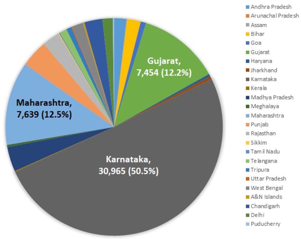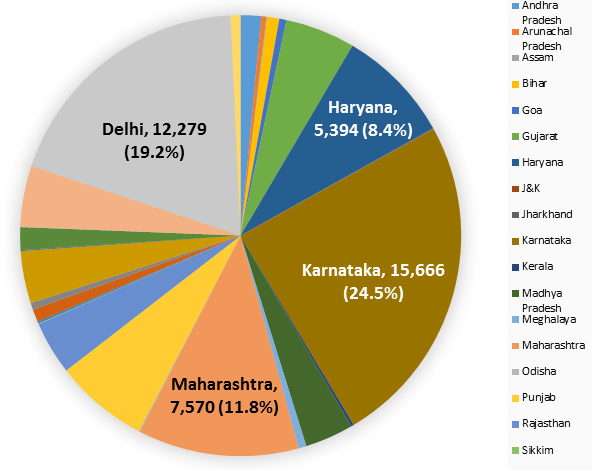 In 2016 there were 64,057 cases of CHIK. From Figure 2 below, it is evident that the major share of CHIK cases are from Karnataka, accounting for 24.5% of the total number of cases. This is followed by Delhi (19.2%), Maharashtra (11.8%), and Haryana (8.4%). Therefore, these four states together account for nearly 64% of all cases.
