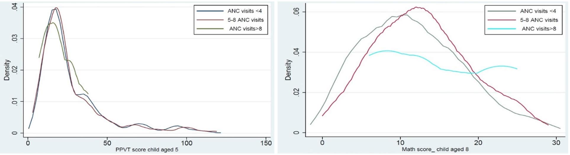 Figure 1. Kernel density estimates of the number of maternal ANC visits on the PPVT (left) and math scores of children (right),