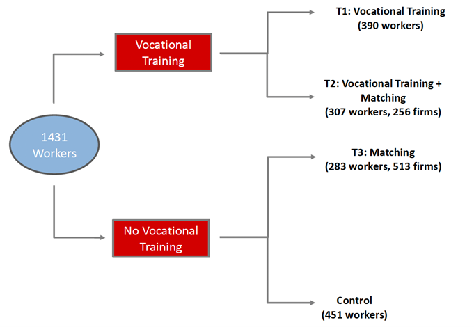 Workers were randomised into three ‘treatment’ (intervention) groups: (i) vocational training; (ii) vocational training combined with a light-touch matching intervention that passes workers’ details to firms; and (iii) matching only. This was done through a two-step procedure, as outlined in Figure 1. Individuals were first randomly assigned to receive an offer of vocational training. This consisted of a six-month sector-specific and classroom-based training programme delivered by reputable vocational training institutes. In an earlier study, we show that this type of training is highly effective at providing workers with valuable skills (Alfonsi et al. 2020). At the second stage, we offered light-touch matching between workers and firms. Worker-firm matches were restricted to take place between firms in the same sector as the worker had been trained in, or had desired to be trained in, and within the same region. Eligible firms were identified through a census of small and medium enterprises. Firms were presented with the CVs of a maximum of two workers that were either both vocationally trained (T2 in Figure 1), or both unskilled but willing to work (T3 in Figure 1). They could decide to call back for an interview neither, one, or both workers.