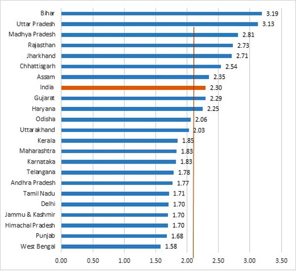 Looking at the demographic future of the country as whole hides the enormous differences across states. Some states like West Bengal (TFR of 1.6 in 2014) and Tamil Nadu (1.7) have TFR close to many European countries, whereas some others like Bihar (3.2) and Uttar Pradesh (UP) (3.1) have equivalents in sub-Saharan Africa.