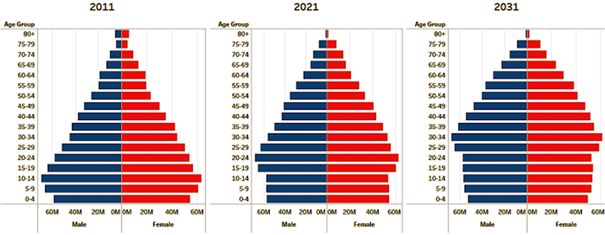 To assess the impact of the demographic bulge on demand for higher education in India, I project population1 and age structure at national and state levels using data from Census 2011 and Sample Registration Survey (SRS) 2014-2015, along with models of fertility decline in states (Retnakumar 2009). Based on these projections, the population pyramids shown below represent the change in age structure in India during 2011-2031. During 2021-2031, the demographic peak will shift to 15-24 years, the crucial cohort to be educated and skilled to prepare for the economy.